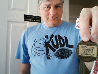 Though I have I have featured Ultimate shirts four times so far in this blog's history (T-shirt #56, KUDL 2009; T-shirt #58, Grey Area; T-shirt #59: KUDL 2007, and T-shirt #60, MUSL 2007), and though one of those (Team Venom, T-shirt #60) won a championship, and though I have been on a few teams that have won Ultimate accolades (my team won the first ever Huckfest in 36 degree temps, sleet, and winds of 25-30 MPH), I am most proud of this win as the KUDL champions of 2010.